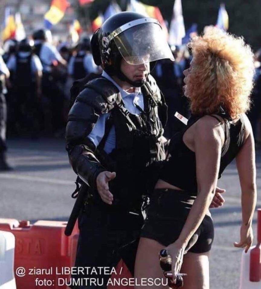 La un moment dat, o adolescentină, cu inconștiența specifică vârstei, s-a cățărat cu scoica pe pulanul vajnicului jandarm, în a cărui privire se putea citi că nu știe să citească nimic de pe buzele ei lubrefiate de ură. Protestatara care l-a contrat contrariindu-l, l-a întrebat: